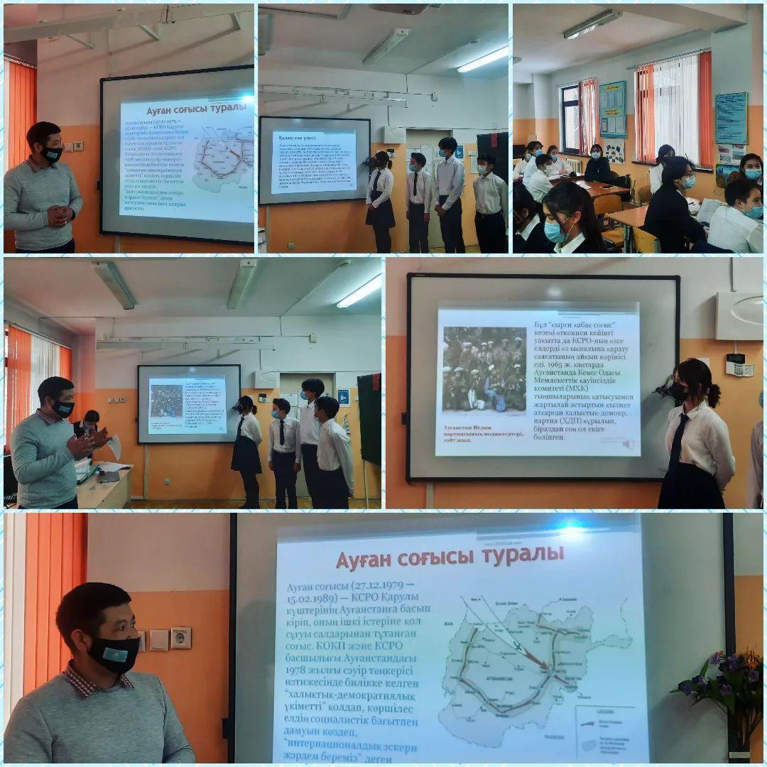 Алматы қаласы Наурызбай ауданы "№187жалпы білім беретін мектеп" коммуналдық мемлекеттік мекемесінде Ауған соғысына 33 жыл толуына орай, тарих пәнінің мұғалімі Оразалиев Н.А. 8 “Ә” сынып оқушыларына «Ауғанстан ардагерлеріне тағзым!» атты тақырыпта танымдық сабақ өткізді. Мақсаты: -Ауған оқиғасының тарихи мағынасын ашып, оқушыларға түсіндіру. -“Ауған соғысы” – жайлы тереңірек біліп тану, соғыс ардагерлерінен мәлімет алу.