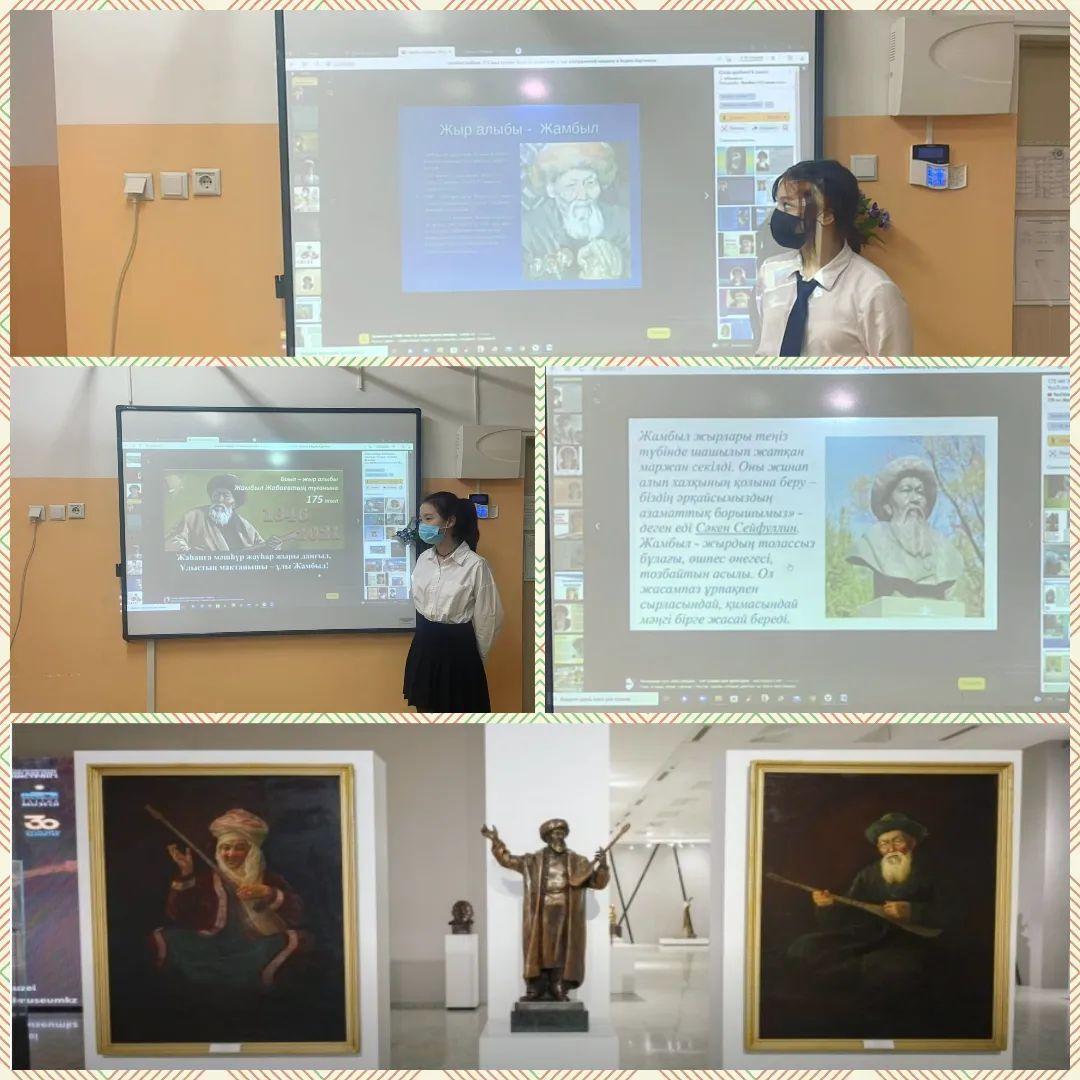 "№ 187 ЖББМ"КММ 15.02.2022 күні оқушылардың Жамбыл Жабаевтың шығармашылығына деген ынтасын ояту, қызығушылығын арттыру, жыр алыбының баға жетпес ұлттық мұрасы арқылы оқушылардың рухани деңгейін дамыту мақсатында 8 “Ә” сыныбының жетекшісі Тышимова Е.С. “Жыр алыбы-Жамбыл”тақырыбында оқушылармен тәрбие сағатын өткізді. Сабақтың мақсаты: Жыр алыбы Жамбылдың ақындық талантын шәкірт жүрегіне ұялату, оқушылардың сөйлеу мәдениетін дамыту, сөз өнерін қадірлеп, қастерлей білуге дағдыландыру, ақын өлеңдерін сүйе білуге үйрету. Ақын шығармалары арқылы ұлтжандылық сезімін оятып, адамгершілікке, елінінің өнерін сүюге тәбиелеу.