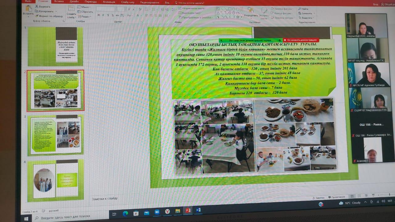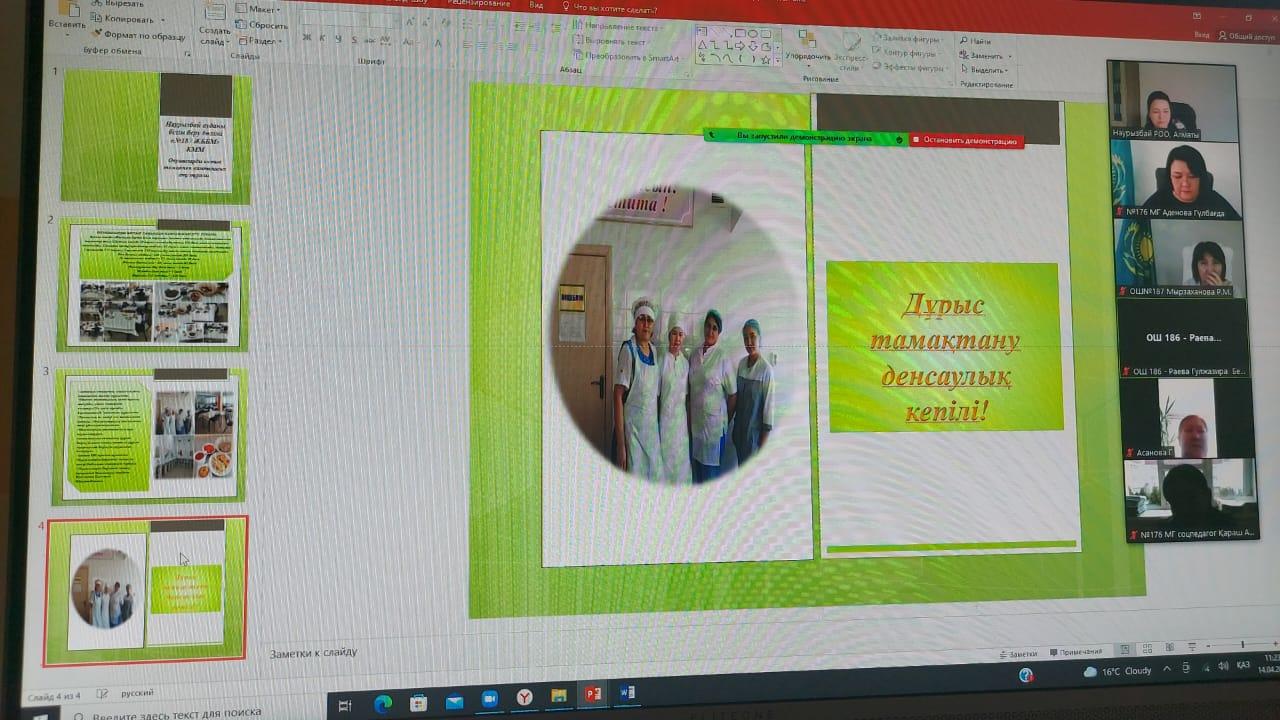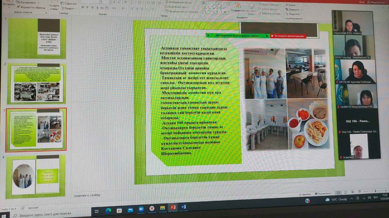 🗓14 сәуір күні «Алматы қаласы Наурызбай ауданы бойынша 187 мектеп оқушыларын сапалы теңдестірілген тамақтанумен қамтамасыз етудің 2021 – 2023 жылдарға арналған Жол картасын іске асыру жөніндегі іс – шаралар жоспарына сәйкес ZOOM платформасы арқылы онлайн аудандық семинар өтті