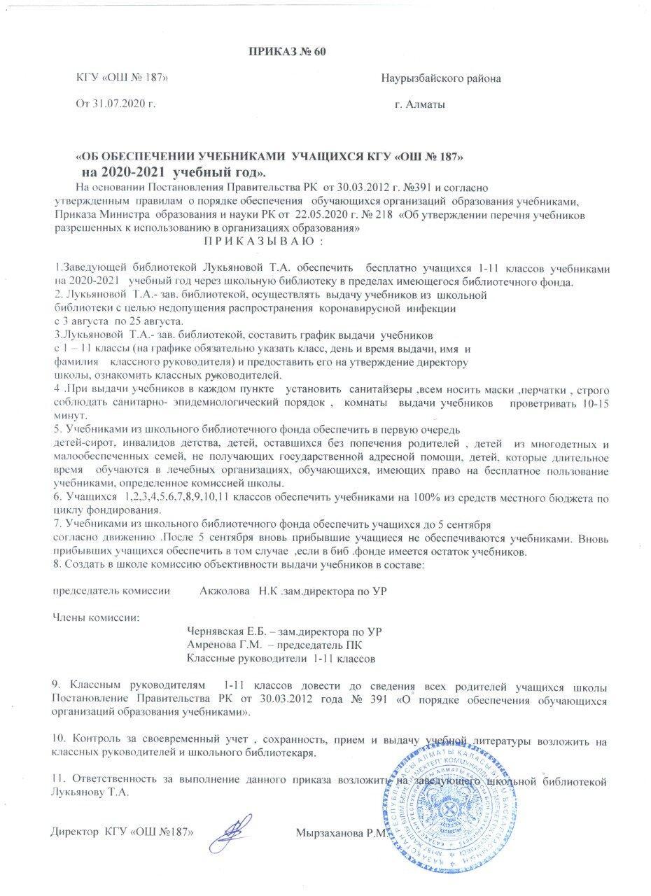 31 июль 2020 0 1 2 3 4 5 Приказ "Об обеспечении учебниками учащихся КГУ "ОШ №187" на 2020-2021уч.год Осы беттің QR-коды:QR-код этой страницы: