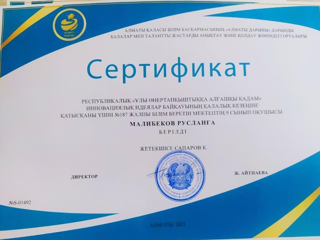 «Алматы дарыны» орталығының ұйымдастыруымен «Ұлы өнертапқыштыққа алғашқы қадам» инновациялық идеялардың республикалық байқауының тың идеясымен ерекшеленіп "187 ЖББМ" КММ 9"Ә"сынып оқушысы Малибеков Руслан қала бойынша I ОРЫН га ие болып,республикалык кезеңге өтті.