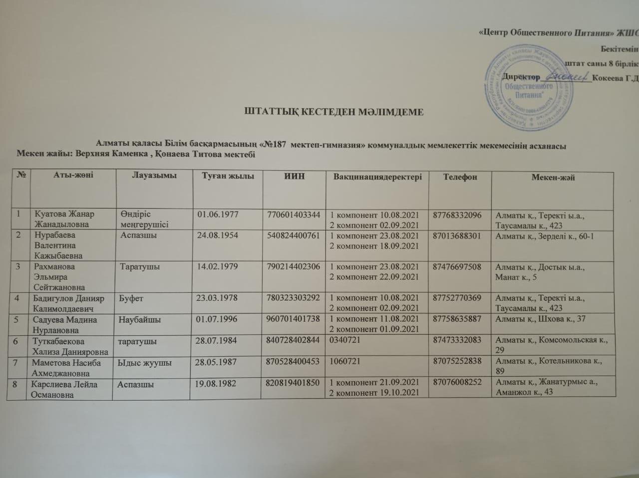 Штаттық кестеден мәлімдеме » КГУ «Общеобразовательная школа №187 » Управления образования г.Алматы