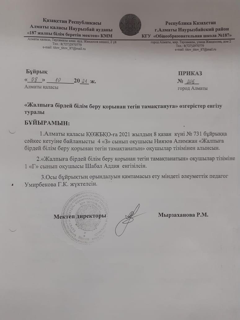 08 октябрь 2021 0 1 2 3 4 5 Бұйрық №206 "Жалпыға бірдей білім беру қорынан тегін тамақтануға" өзгерістер енгізу туралы Осы беттің QR-коды:QR-код этой страницы:
